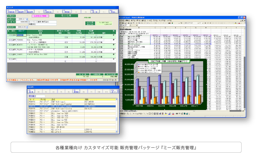 市販パッケージソフトに機能を追加する場合、その機能追加による影響がパッケージ全体に及び為に、使わない機能なのにその影響を考慮して対応しなくてはならなかったりして開発コストが膨れ上がることがあります。 ミーズシステム株式会社の販売管理では最低限必要なベースにお客様独自の要望を反映していく為、基本がしっかりしているのにコンパクトになる為、低コストで導入が可能です。